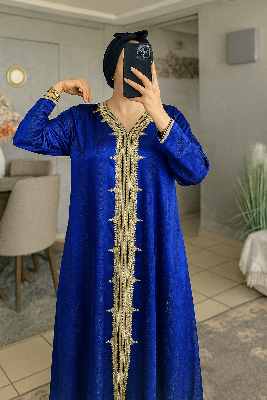 - Long caftan marocain couleur bleu roi avec sfifa dorée authentique
