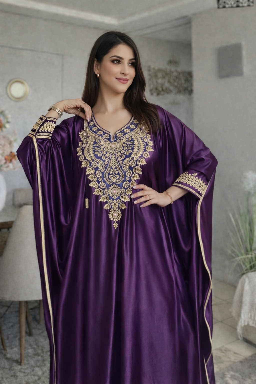 Cette magnifique Gandoura en velours est ornée de broderies et de perlages