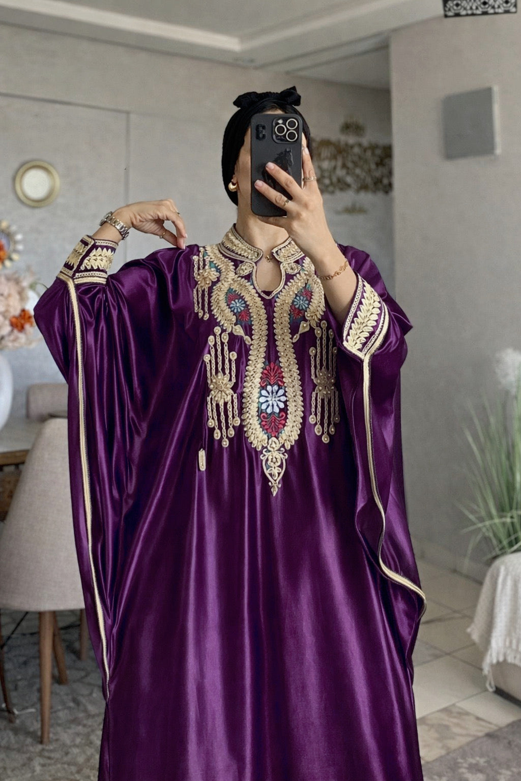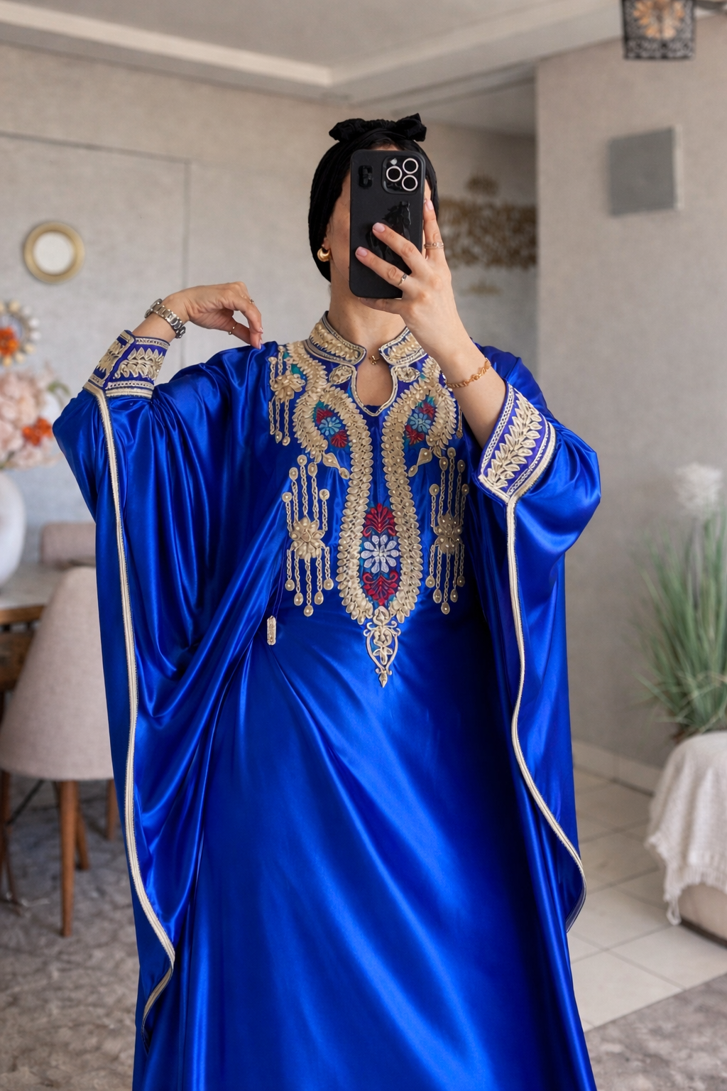 Cette guandoura est conçue avec broderie et strass, ajoutant une touche de